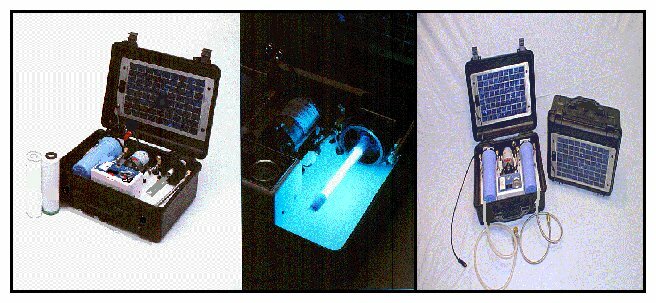 | These Portable, Solar Battery / 12-volt Powered Water Purification Systems pull the water from the source and through a 5.0 micron Sediment Pre-Filter. The water is then pushed through a Carbon Block Polishing Filter that has the capabilities of removing Giardia and Cryptosporidium Cysts, Herbicides, Pesticides, Trihalomethanes (THMs), certain Volatile Organic Chemicals (VOCs), Chlorine and Chlorine By-Products, Sediment, Bad Taste, Odors, Color, Smell, and many other Harmful Chemicals and Contaminants down to a 0.5 micron. The polished filtered water is then channeled past an Ultraviolet Light Disinfecting Process that has the ability to kill Bacteria, Viruses, Typhoid Fever, Coliform, Dysentery, Cholera, Infectious Jaundice, Hepatitis and Influenza Virus, E-coli, Enteric Fever and many other unwanted microorganisms to a 99.999% purity. |
