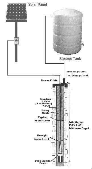 Solar powered water pumping systems can pump water from wells as deep as 200 meters (600 feet) at a volume rate of 11000 liters (3000 gallons) per day with daily water production volumes upwards in different applications of 55,000 liters (15,000 gallons) per day or more.